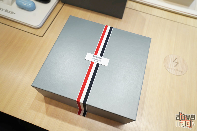 겉에 상자를 빼면 안쪽에 톰브라운 패키지를 느낄 수 있는 상자가 들어 있습니다. 톰브라운을 상징하는 3색의 라인과 삼성 톰브라운 표시가 되어 있습니다.