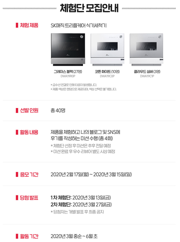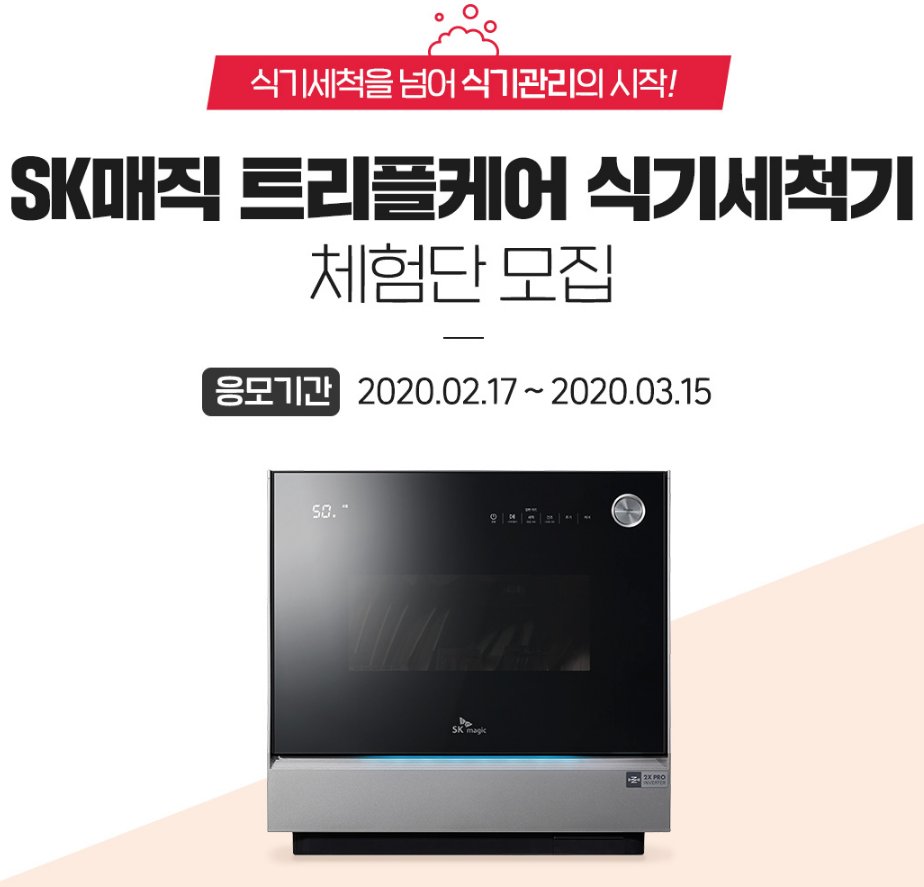 SK매직 트리플케어 식기세척기 체험단은 3월 15일까지 모집하고 총 40명에게 행운이 돌아갑니다. 제품 색상은 랜덤이라고 하니 참고하시기 바랍니다.