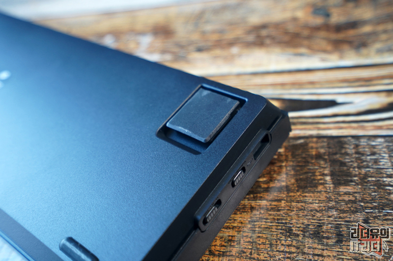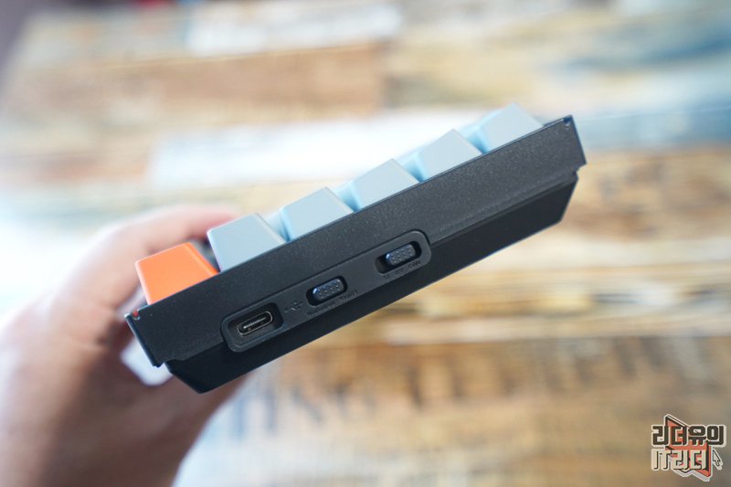 왼쪽에는 충전 및 유선 연결을 지원하는 USB-C 타입 포트가 있고 윈도우/안드로이드와 맥OS를 선택할 수 있는 스위치, 블루투스, 전원OFF, 케이블을 선택할 수 있는 스위치가 있습니다. 직관적으로 사용할 수 있는 스위치 방식이라 빠른 조작성이 좋습니다.