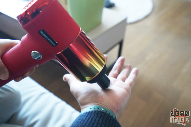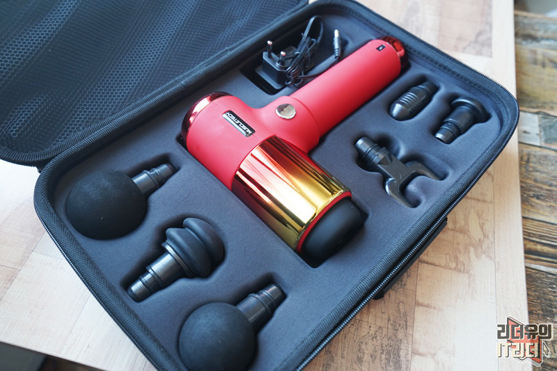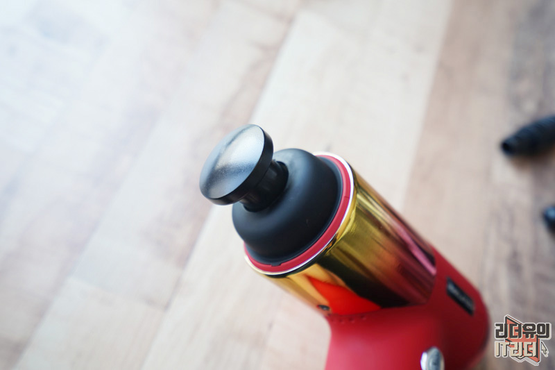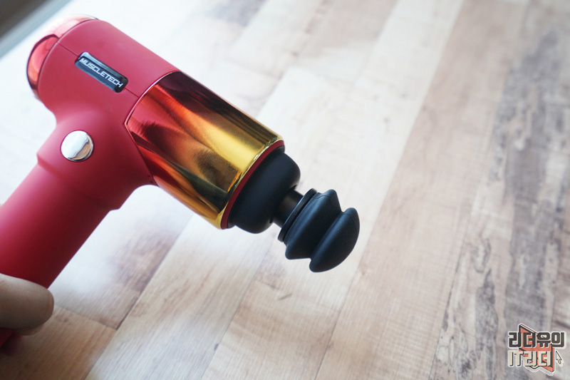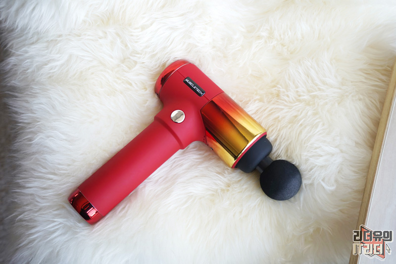마사지건들이 아무래도 투박한 디자인들이 많은데 머슬테크 마사지건은 화사한 레드 컬러를 적용했고 무광으로 고급스러운 디자인을 느낄 수 있습니다. 헤드 부분은 고급스럽게 알루미늄으로 되어 있고 그라데이션 코팅으로 처리해 감각적인 디자인 포인트가 되어 줍니다.