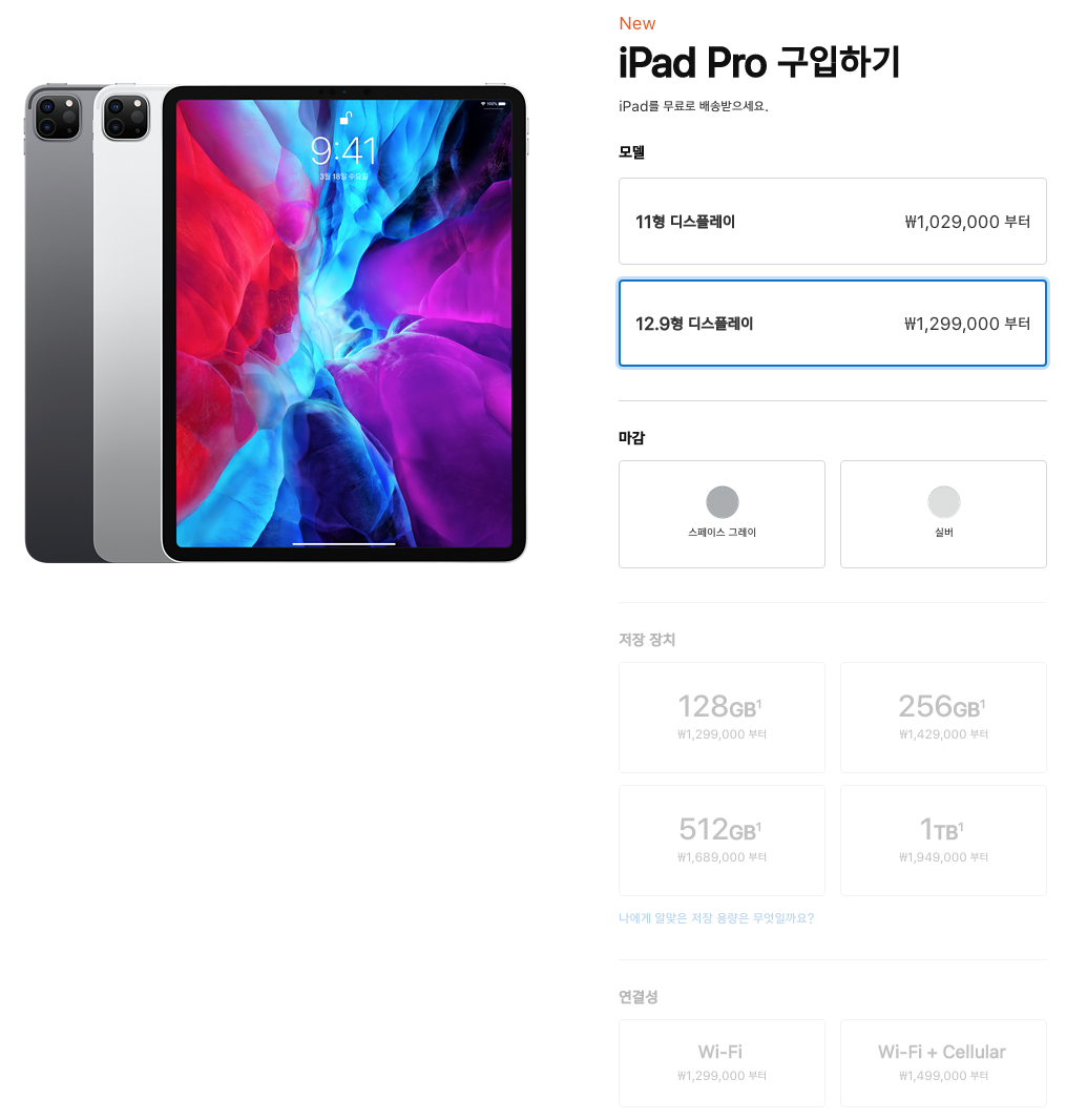 아이패드 프로 4세대 12.9형은 1,299,000원 부터 시작을 합니다. 옵션 선택은 똑같습니다. 용량 선택, WiFi, Cellular 자신의 용도에 맞게 선택을 하시면 됩니다.