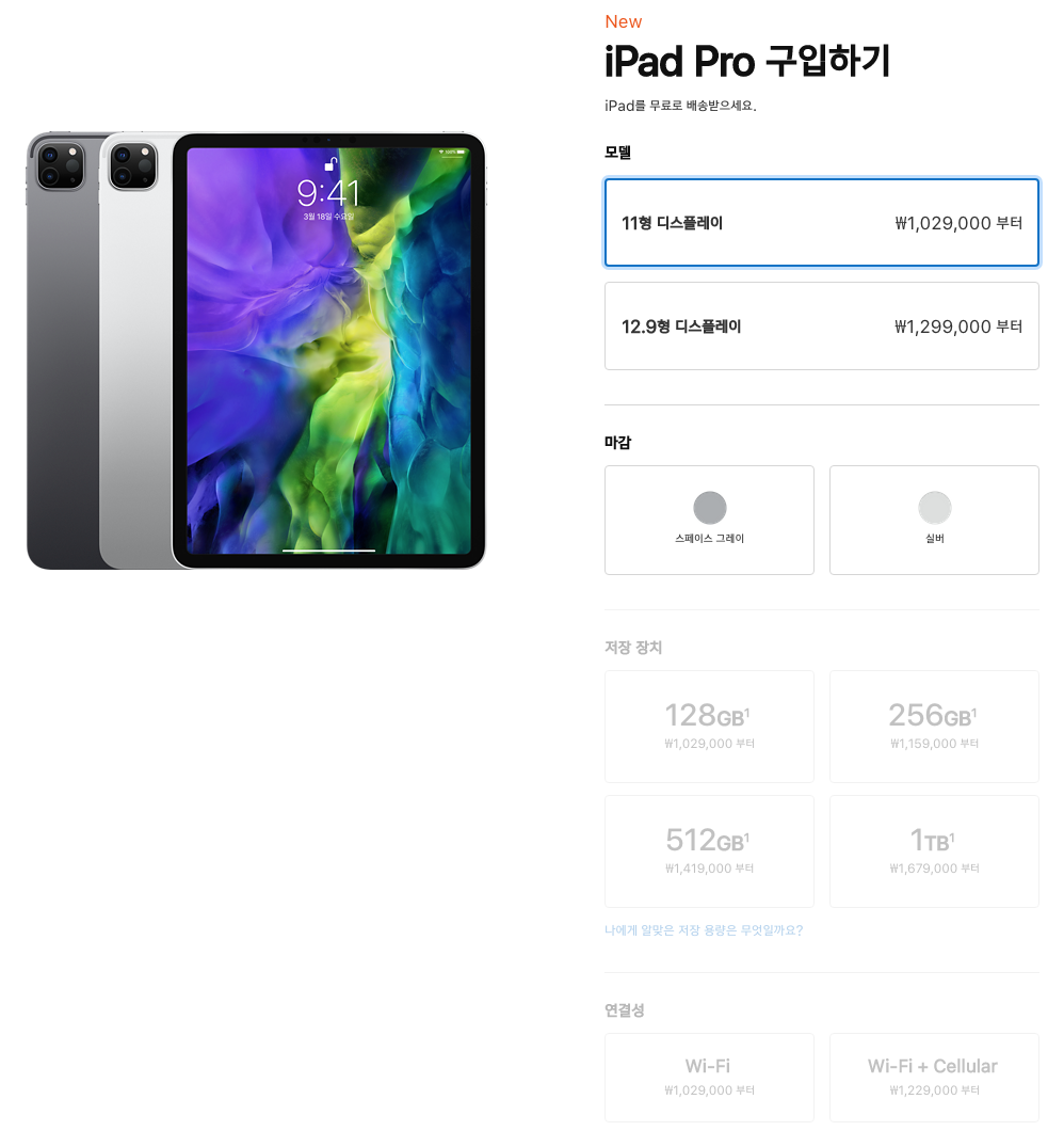 아이패드 프로 4세대 11형 가격은 1,029,000원 부터 시작합니다. 저장공간은 128GB부터 시작하고 256GB, 512GB, 1TB 선택이 가능합니다. 그리고 Wi-Fi, Cellular 선택이 가능하니 자신에게 필요한 옵션을 잘 고민해서 선택하시면 됩니다.