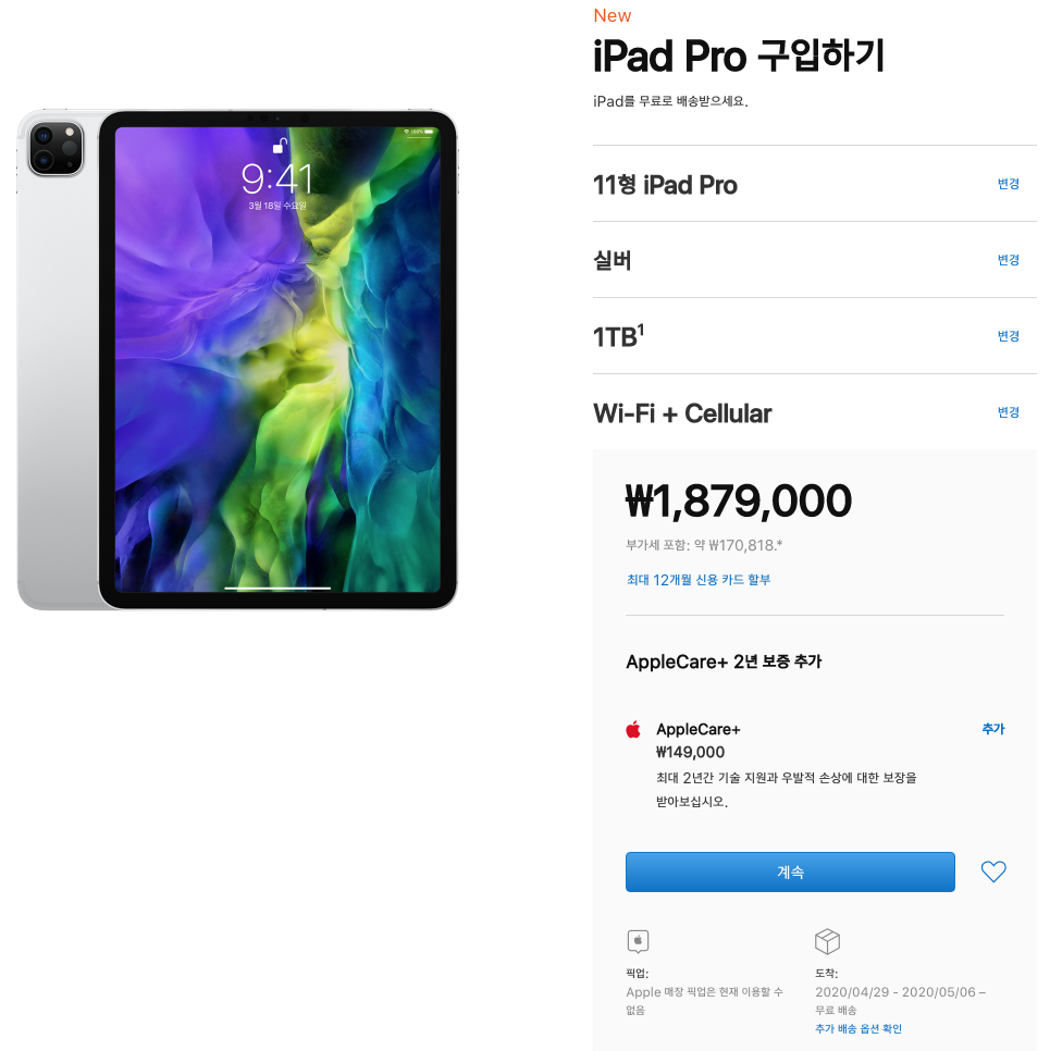 아이패드 프로 4세대 11형 기준으로 애플케어플러스 가격은 149,000원이고 현재 매장 픽업은 안되고 4월 29일부터 배송을 받을 수 있습니다. 10일 가량 남았으니 서둘러서 구매를 해야 최대한 빨리 받을 수 있습니다.
