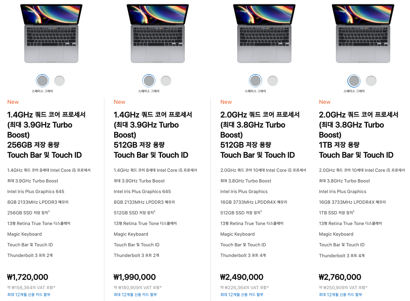 2020 맥북프로 13은 4종류로 기본 셋팅을 해두었습니다. 가장 낮은 모델은 2019 맥북프로 13보다 2만원 저렴해졌는데요. 저장공간이 256GB로 2배 증가했고 매직 키보드로 개선이 된 매력까지 갖추고 있습니다. 용량이 부족해서 기존에는 선택 대상이 되지 못했지만 2020 맥북프로 13은 기본 모델 부터 상품성이 더 좋아졌습니다.
