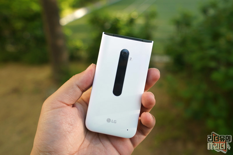 LG 폴더2를 펼친 뒷 모습입니다. 올 화이트로 깨끗한 디자인 매력을 보여주고 있습니다.