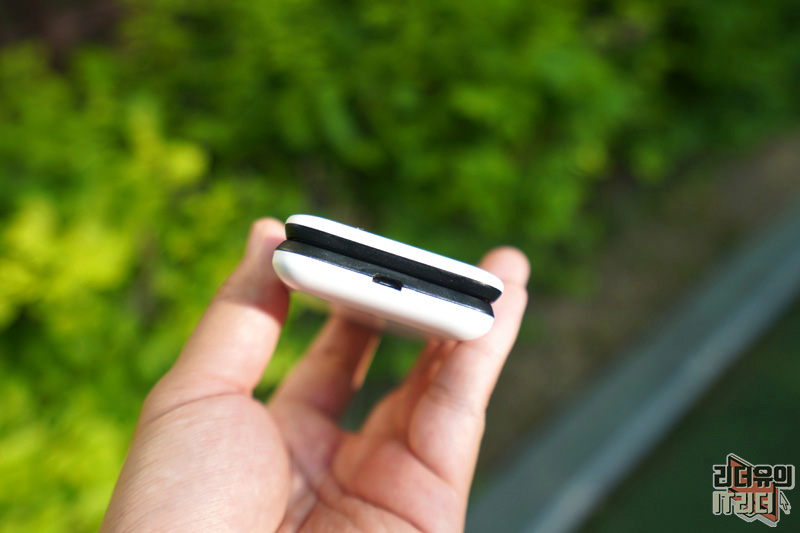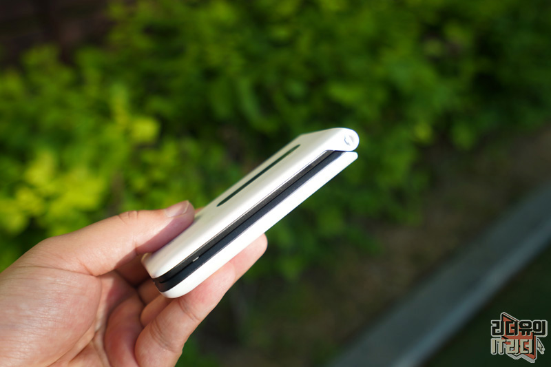 반대쪽면에는 버튼 없이 깔끔한 면으로 되어 있고 힌지 부분에는 스트랩 고리가 있습니다.