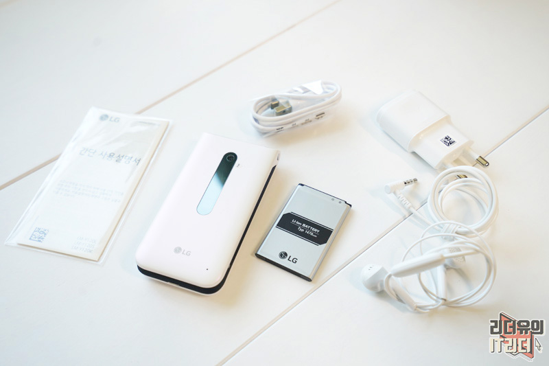 LG 폴더2 구성품은 본체, 배터리 1개, 이어폰, 어댑터, Micro5핀 케이블로 구성되어 있습니다.