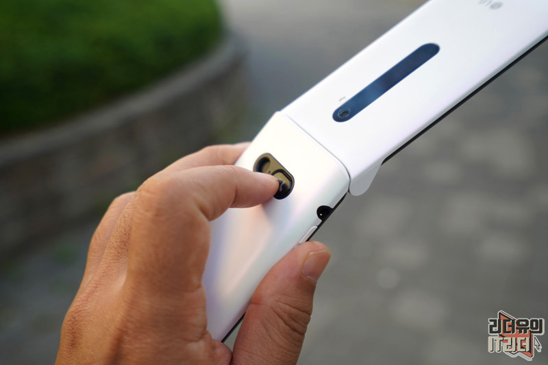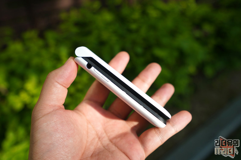 왼쪽면에는 이어폰 단자와 볼륨 버튼이 있습니다. 안쪽에는 블랙 프레임으로 되어 있어 투톤의 디자인을 볼 수 있습니다.