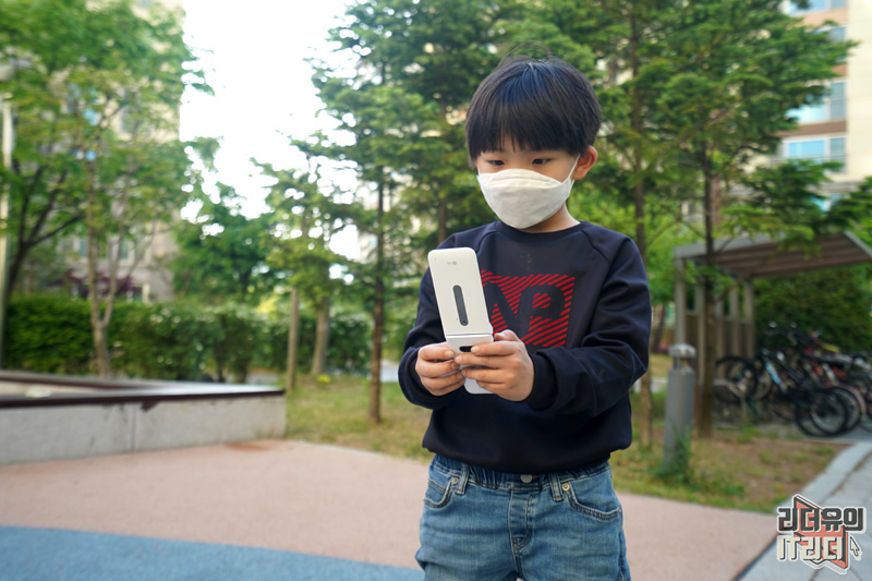 접으면 휴대하기 좋은 사이즈로 변신! 키즈폰은 아무래도 휴대성도 고려해야 하는데요. 접었을때 사이즈가 반으로 줄어들고 디스플레이도 안쪽에 위치하고 있기 때문에 안심하고 사용할 수 있습니다.