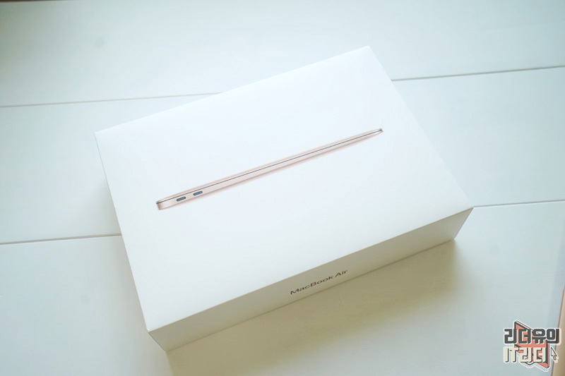 맥북에어 2020 패키지 입니다. 슬림한 라인의 맥북에어 모습을 강조해서 보여주고 있습니다.