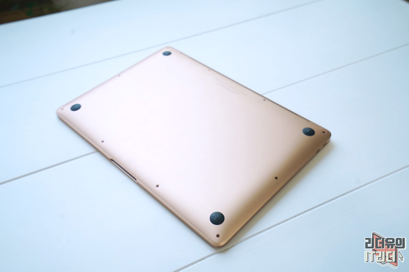 바닥면에는 네 귀퉁이에 고무패킹이 있습니다. 참고로 맥북에어는 추가 업그레이드가 불가합니다. 처음에 선택할때 잘하셔야 하는데요. 맥북에어 2020은 기본형만 선택해도 충분히 가성비 좋게 잘 나왔습니다.