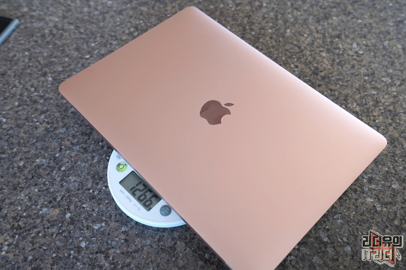 맥북에어 2020 무게는 스펙상 1.29kg 이지만 저울에 올려 보니 1.26kg 정도로 측정되었습니다. 저울에 따라 다를 수 있지만 가볍게 휴대할 수 있는 노트북임에는 분명합니다.