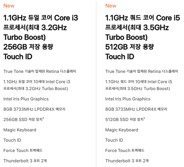 맥북에어 2020 스펙을 보면 인텔 10세대 코어 i3부터 기본 모델이 시작됩니다. RAM은 8GB라 여유롭고 저장공간은 전작에 비해 2배나 많아졌습니다. 기본 256GB라 확실히 넉넉한 사용 공간을 느낄 수 있습니다. 그러면서도 가격이 오르지 않았기 때문에 오히려 저렴해진 기분을 느낄 수 있습니다.