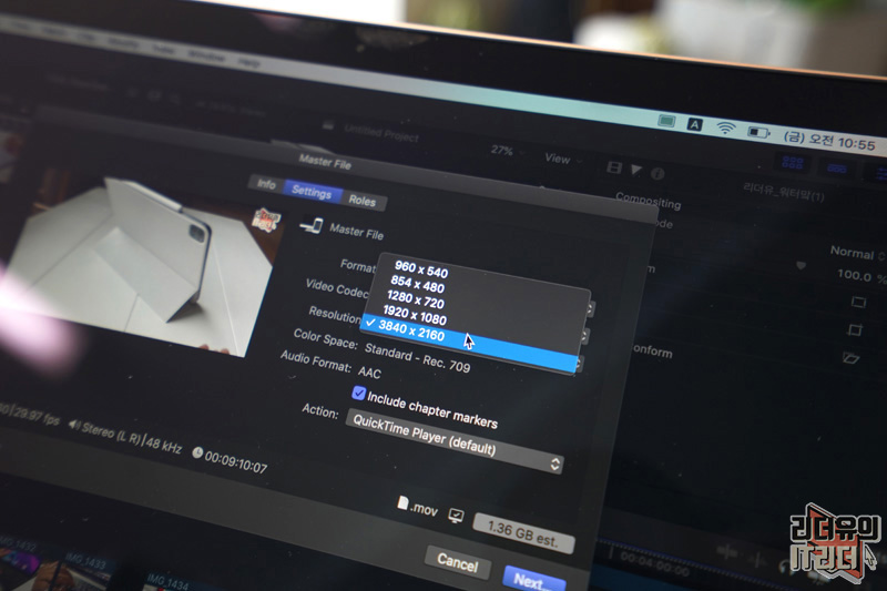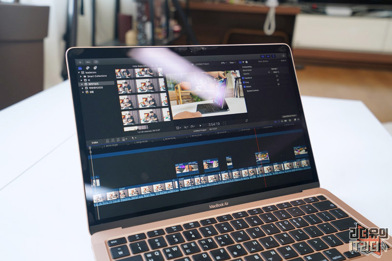 얼마나 성능이 좋은지 파이널컷프로 로 영상 편집도 해봤습니다. 영상 편집용으로 맥북에어가 적합한 모델은 아니지만 FULL HD 랜더링은 적절하게 할 수 있고 4K 랜더링도 가능합니다. 다만 시간이 좀 더 걸리고 발열이 생기게 됩니다.