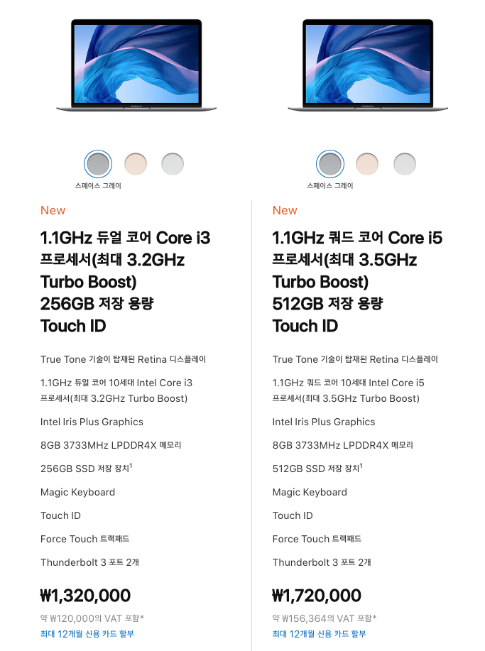 맥북에어 2020 스펙을 보면 인텔 10세대 코어 i3부터 기본 모델이 시작됩니다. RAM은 8GB라 여유롭고 저장공간은 전작에 비해 2배나 많아졌습니다. 기본 256GB라 확실히 넉넉한 사용 공간을 느낄 수 있습니다. 그러면서도 가격이 오르지 않았기 때문에 오히려 저렴해진 기분을 느낄 수 있습니다.