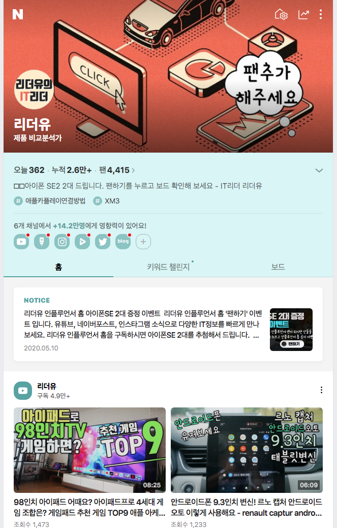 리더유 인플루언서 홈 입니다. 다양한 IT 소식을 한눈에 볼 수 있는 곳이니 팬추천 꼭 해주세요^^ 오픈 기념으로 아이폰SE 2대를 준비했습니다. 그리고 곧 유튜브도 5만이 되는데 5만 구독자 이벤트도 기대해 주세요^^