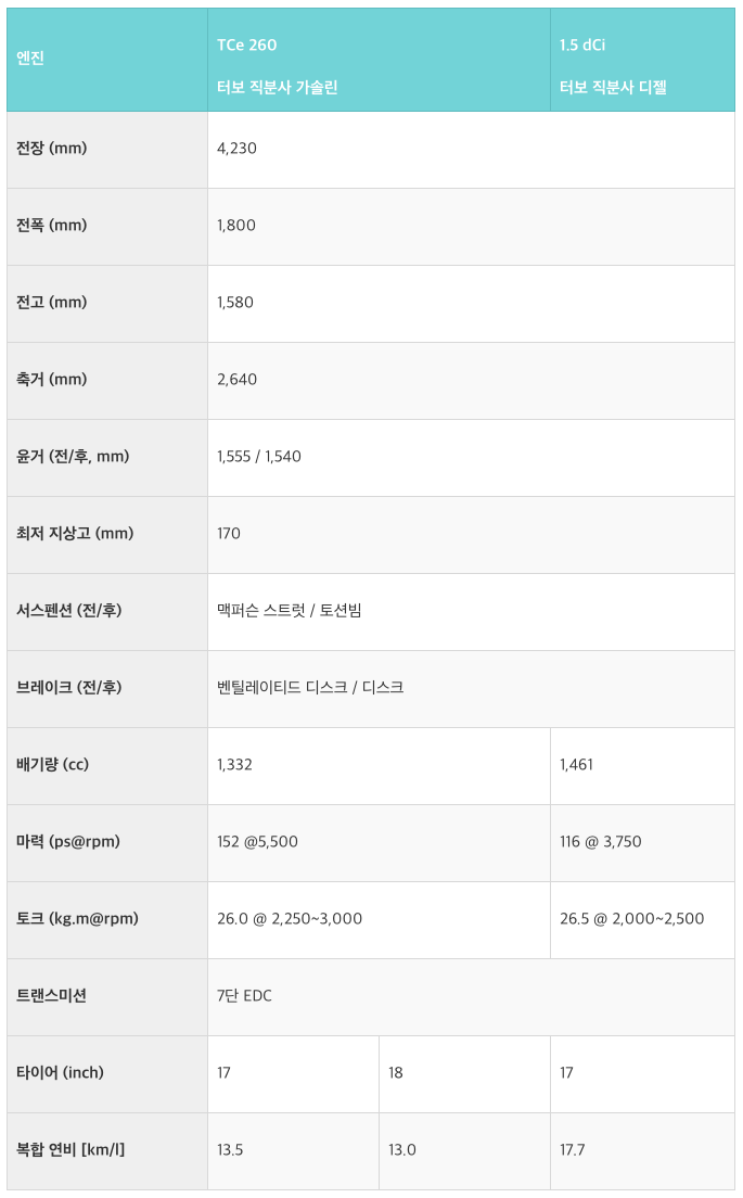 TCe260 복합 연비는 17인치 타이어 기준 13.5km/l 이고 1.5dCi 복합연비는 17.7km/l 입니다.