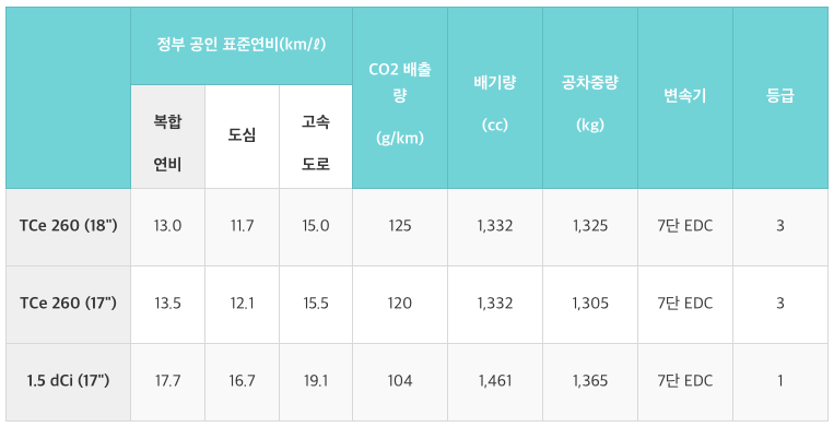 TCe260 복합 연비는 17인치 타이어 기준 13.5km/l 이고 1.5dCi 복합연비는 17.7km/l 입니다.