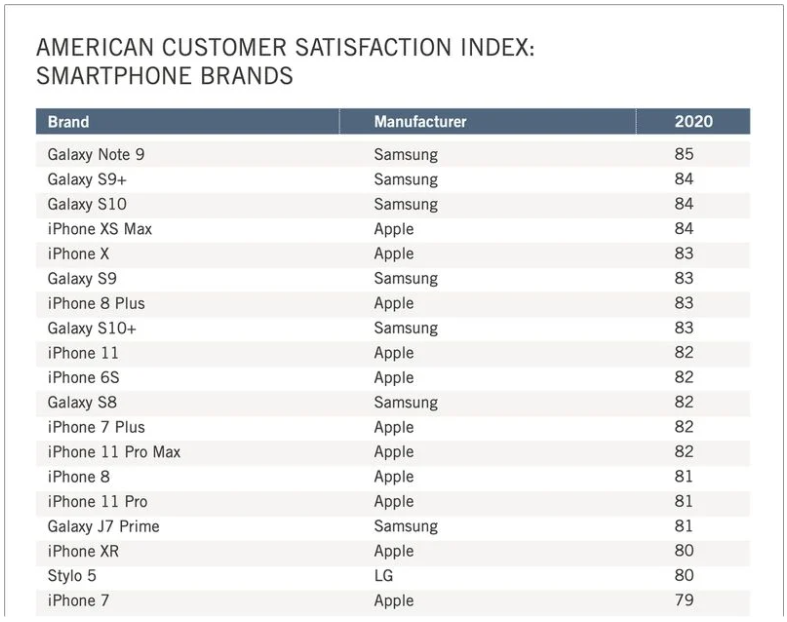 2020 미국 스마트폰 만족도 점수도 공개되었는데요. 갤럭시노트9이 85점으로 가장 높은 점수를 받았습니다. 판매 수량이 많은건 아니지만 구입한 사람들로 부터 호평을 받았다는 의미입니다.