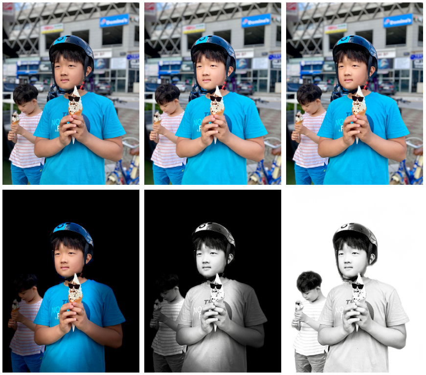 같은 사진을 왼쪽 상단부터 자연 조명, 스튜디오 조명, 윤곽 조명, 무대 조명, 무대 조명 모노, 하이키 조명 모노 6가지 모드의 차이입니다. 여기서 주목해 봐야 할 기술은 배경을 완벽하게 구분해 냈다는 것입니다.