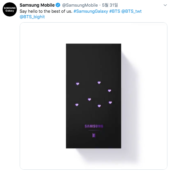삼성전자가 갤럭시S20 마케팅을 BTS (방탄소년단)을 통해 알리고 있는데요. 삼성 모바일 공식 트위터를 통해 BTS 에디션 (방탄소년단 에디션)을 "Say Hello to the best of us"라는 문구와 함께 티저 영상을 공개했습니다. 전세계에서 가장 뜨거운 슈퍼스타인 만큼 이번 BTS 에디션 (방탄소년단 에디션)의 파급력도 상당할 거라 보이는데요. 물량이 적게 나온다면 대란 사태까지 일어나지 않을까 합니다.