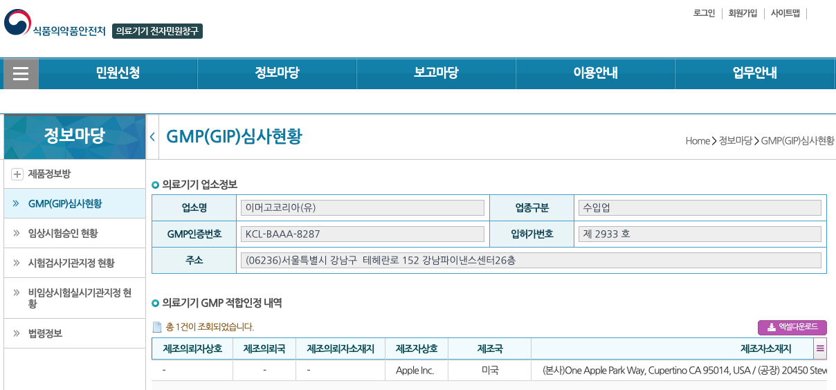 애플 생체현상 측정기기 GMP 심사 승인