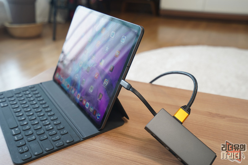 아이패드 프로 4세대 12.9인치에 연결을 하려면 USB-C 포트이기 때문에 HDMI 연결이 가능한 허브가 있어야 합니다. 일반적인 아이패드는 라이트닝 단자를 지원하니 라이트닝 단자에 연결해서 사용하는 허브를 이용하면 됩니다.