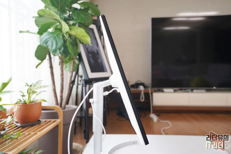 바닥에 거의 붙일 수도 있고 목을 위쪽으로 길게 세워서 편안한 화면을 볼 수도 있습니다. 모니터 받침대가 필요 없습니다.