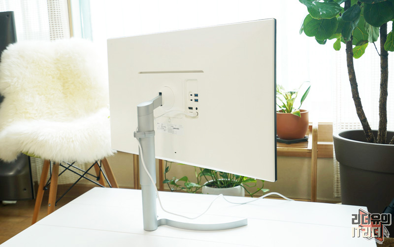 LG 울트라HD 모니터 32UL950 뒷모습을 보면 튼튼한 기둥 모양의 스탠드로 되어 있습니다. 사용자 마다 다른 눈높이에 맞게 높낮이 조절이 가능한 모니터로 되어 있습니다.