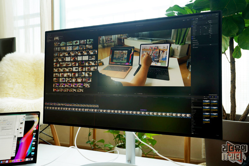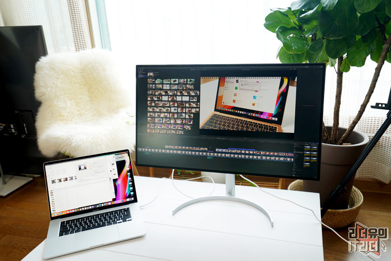 LG 울트라HD 모니터 32UL950은 일반적인 PC 모니터로도 매력적이지만 맥북프로와 환상적인 조합을 통해 작업 환경을 개선할 수 있습니다. 영상 작업시 32인치 대화면으로 하면 너무나 쾌적한 작업이 가능합니다. 좌우로 스크롤을 많이 하지 않아도 되서 좋고 시원시원하게 작업 할 수 있어 데스크탑과 똑같은 사용을 할 수 있습니다.