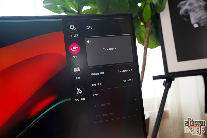 입력에는 썬더볼트가 연결되어 있음을 보여주고 있습니다. 그리고 PBP 기능을 지원해 2대의 PC 화면을 잘반씩 뛰어 모니터 2대를 쓰는 효과도 가져갈 수 있습니다.