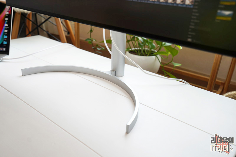 스탠드는 메탈릭 디자인으로 날렵하면서도 공간 활용에 좋은 디자인을 가지고 있습니다. 최대한 공간을 차지 하지 않게 슬림한 디자인으로 되어 있는데요. 부드러운 타원형 디자인으로 인테리어적인 매력도 갖추고 있습니다.