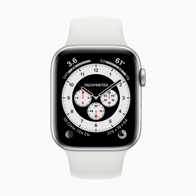 watchOS 7에서 새롭게 선보인 크로노그래프 워치 페이스 화면입니다. 속도계를 안쪽에 넣어 다양한 시간 기록을 할 수 있습니다.