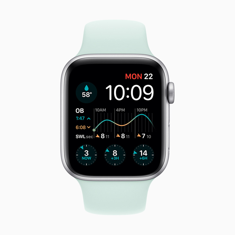 서퍼를 위한 워치페이스를 보면 수온, 풍속 등 바다 상태를 알 수 있는 다양한 정보들을 워치페이스에 넣어서 볼 수 있습니다.