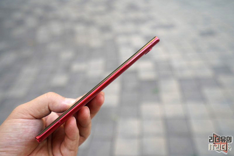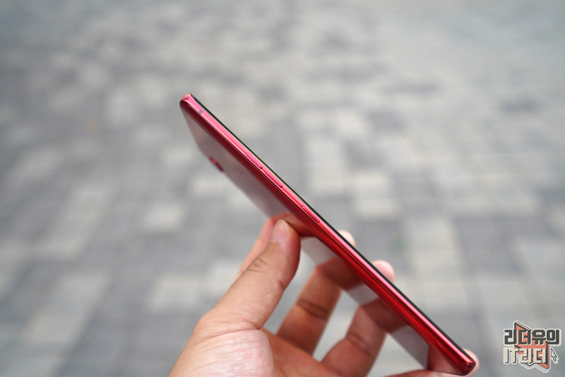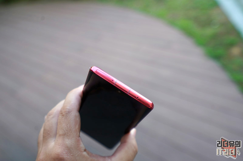 LG 벨벳 오로라 레드 왼쪽면에는 볼륨 버튼과 구글 어시스턴트 키가 있습니다. 테두리 라인도 레드로 처리해 통일감있는 디자인을 가지고 있습니다.