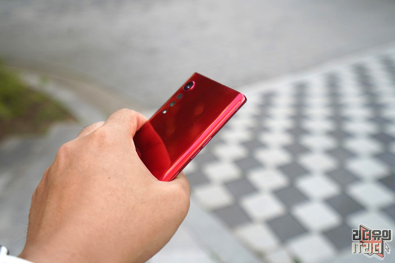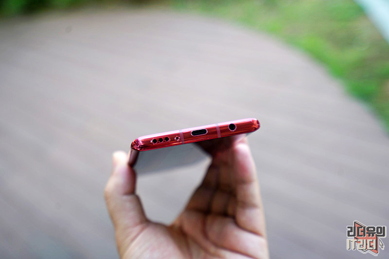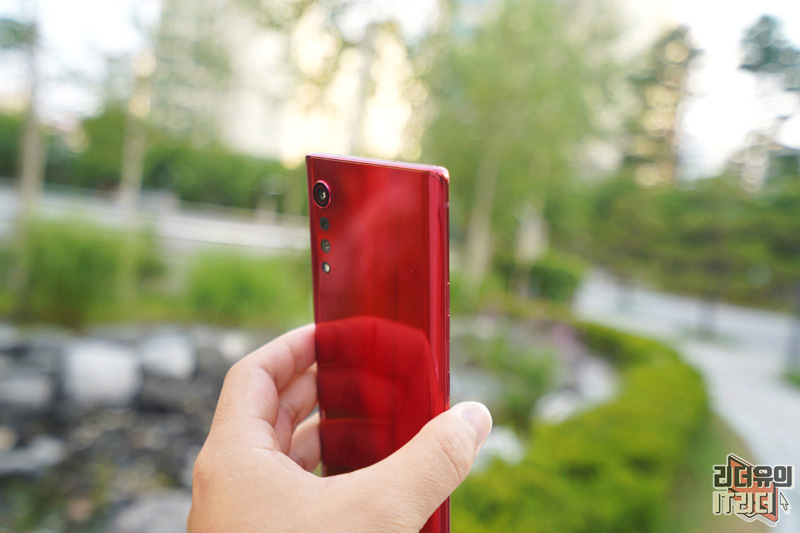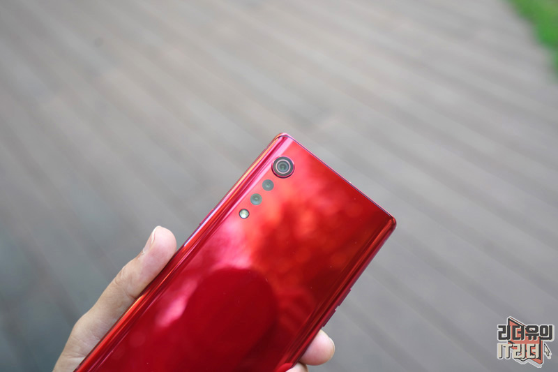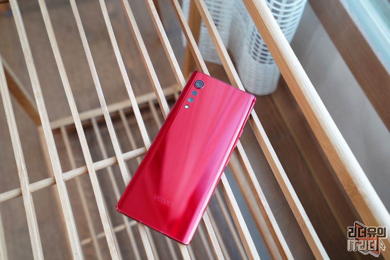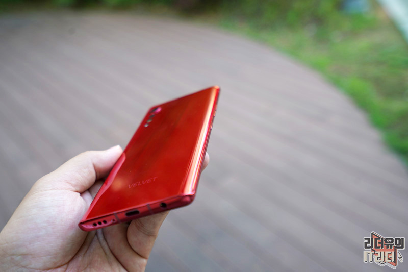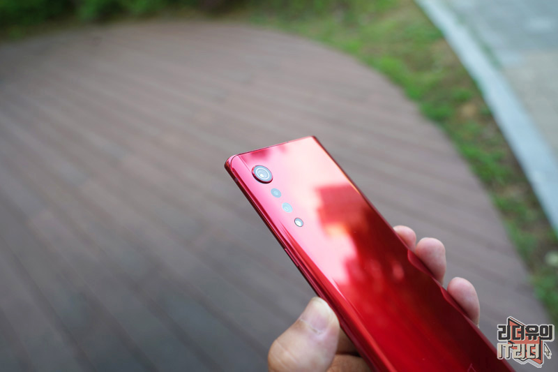 LG 벨벳의 디자인 포인트인 물방울 카메라 부분입니다. 메인 카메라는 이미지 센서를 크게 하면서 카툭튀가 나올 수 밖에 없었는데요. 이 부분을 디자인으로 재해석해 물방울 카메라의 모습을 보여주고 있습니다. LG 벨벳 오로라 레드 컬러에 맞게 카메라 테두리 링도 레드로 처리되어 통일감을 주고 있습니다.