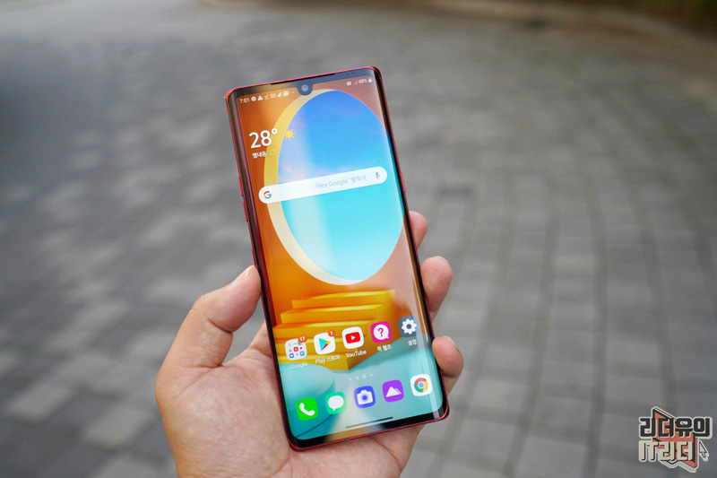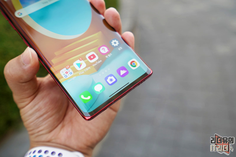 LG 벨벳 오로라 레드를 손에 든 모습입니다. 강렬한 레드 컬러로 시선을 확 사로 잡습니다. 그리고 손에 쥐었을때도 느낌이 좋은데 양사이드를 보면 3D 아크 디자인이 적용되어 그립감과 디자인 매력을 살리고 있습니다.