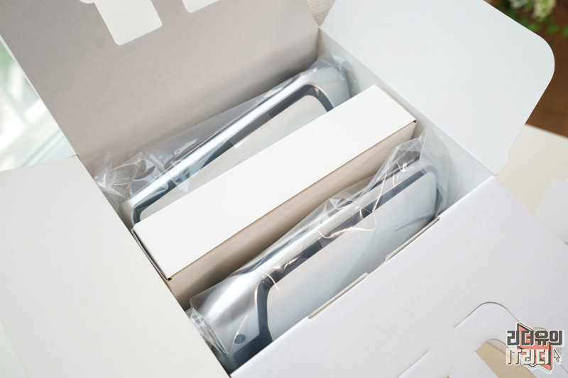 가운데 상자에는 12V/3.5 A 전원 어댑터 2개, 2m 이더넷 케이블 1개가 들어 있습니다.