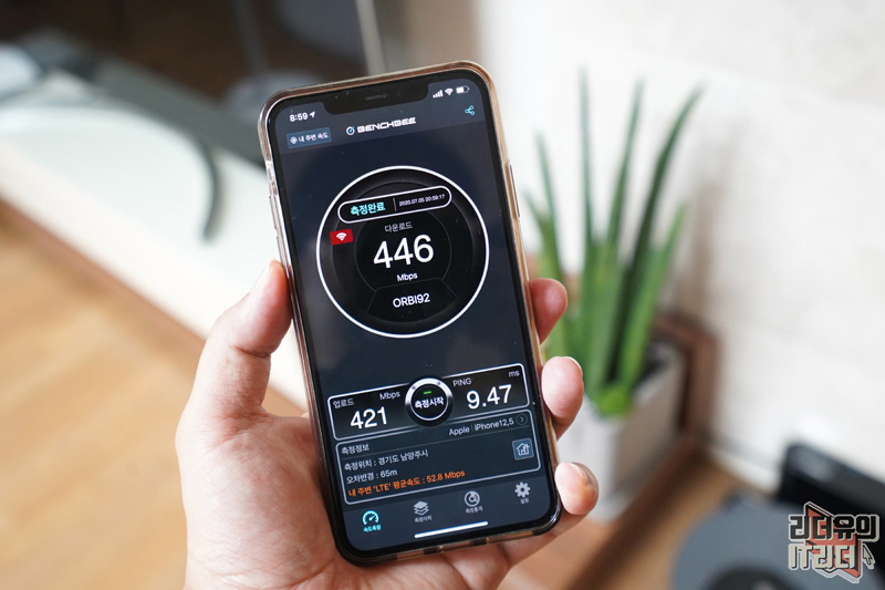 오르비 RBK852로 변경하고 속도 체크를 하니 다운로드 446Mbps, 업로드 421Mbps가 나왔습니다. 공유기 스펙이 얼마나 좋은지 잘 보여주는 부분입니다.
