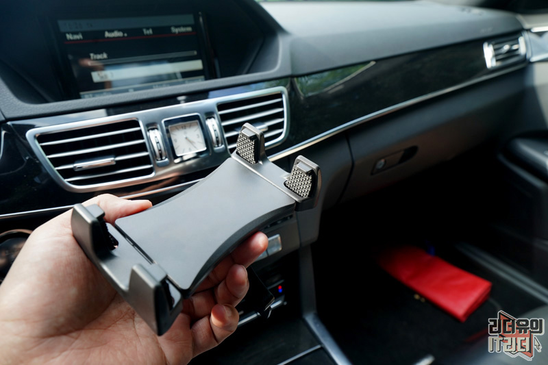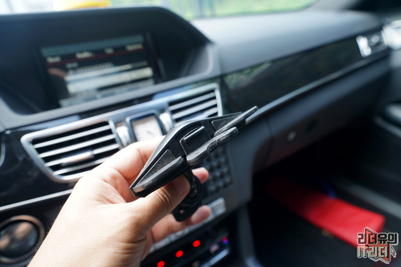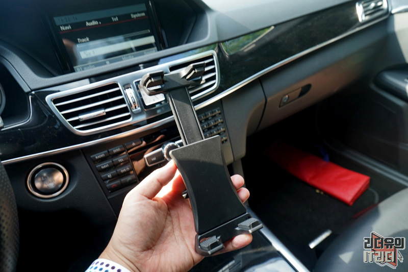 아이패드를 거치하면 앞으로 살짝 나와 있는 구조입니다. 디자인적으로 크게 아쉬움은 없지만 뒤에 버튼을 누르기엔 불편한 점이 있지만 벤츠 E클래스의 경우 가려지는 부분에 중요한 버튼은 없어서 사용상 불편함은 없습니다. 멀티미디어 관련은 핸들 리모컨으로 컨트롤 하니 어렵지 않습니다.