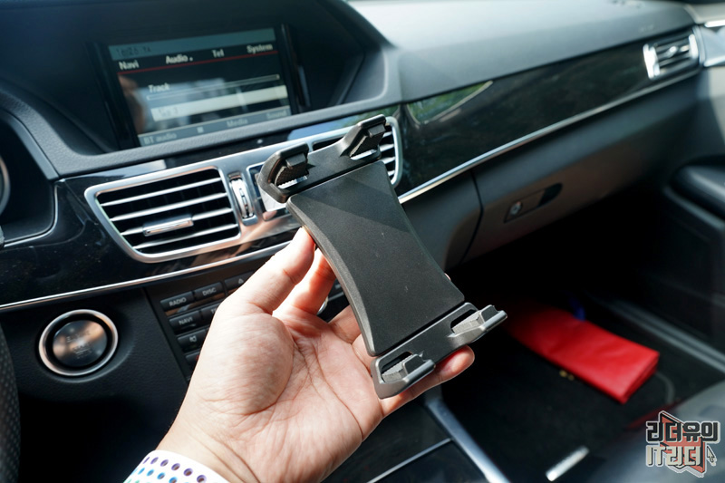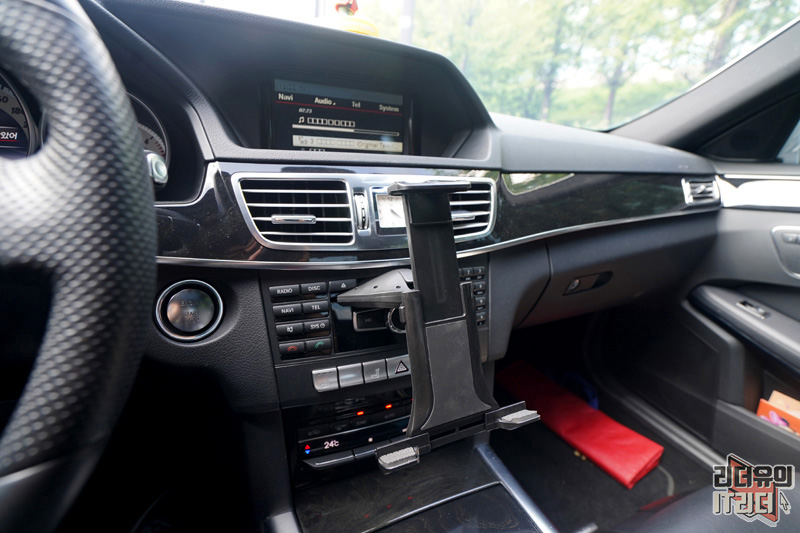 아이패드를 거치하면 앞으로 살짝 나와 있는 구조입니다. 디자인적으로 크게 아쉬움은 없지만 뒤에 버튼을 누르기엔 불편한 점이 있지만 벤츠 E클래스의 경우 가려지는 부분에 중요한 버튼은 없어서 사용상 불편함은 없습니다. 멀티미디어 관련은 핸들 리모컨으로 컨트롤 하니 어렵지 않습니다.