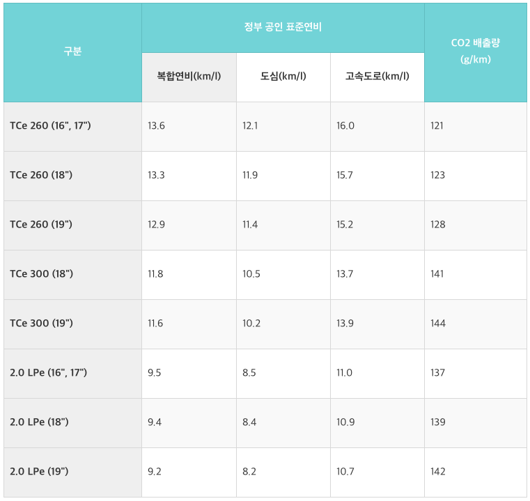 그리고 TCe 260은 최근 선보인 르노 캡처, 르노삼성 XM3에 적용한 르노그룹과 다임러가 공동개발한 신형 4기통 1.3 터보 직분사 가솔린 엔진인데요. 최고 출력 156마력, 최대 토크 26.5kg.m(260Nm)으로 실용 주행 영역인 1,500rpm에서 3,500rpm 구간 내에서 놀라운 주행성능을 볼 수 있습니다. 그리고 놀라운 점은 연비 경쟁력이 좋다는 것입니다. 13.6km/L (16/17인치 타이어 기준)로 국산 가솔린 중형세단 가운데 가장 좋은 수준을 보여주고 있습니다.