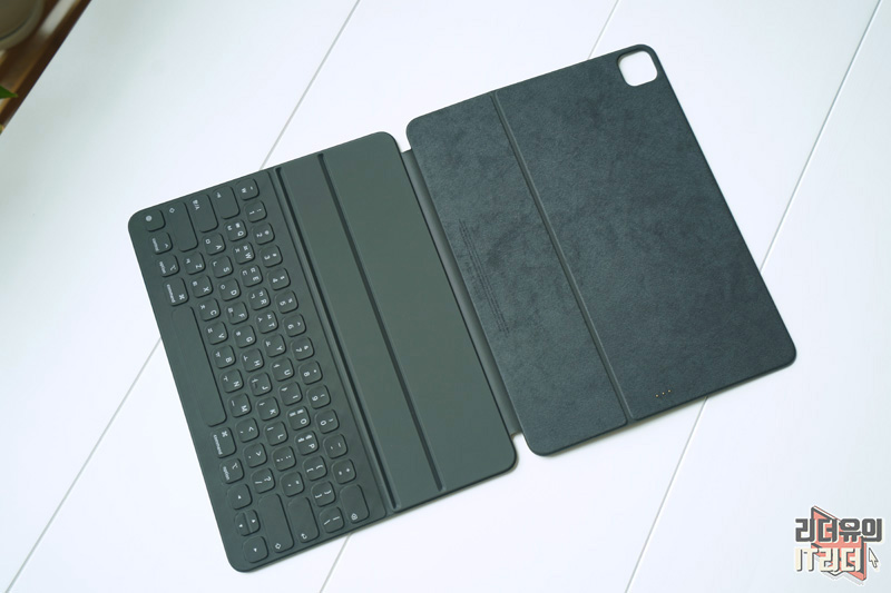 스마트 키보드 폴리오를 펼치면 이런 느낌입니다. 휴대시 아이패드 프로 4세대 앞뒷면을 다 보호해 주기 때문에 케이스 역할도 하는 키보드 입니다.