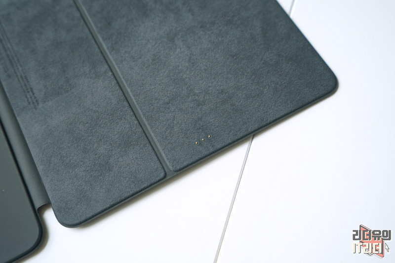 아이패드 프로 4세대 스마트 키보드 폴리오 덮개 전면 모습은 아무런 무늬 없이 깔끔하게 되어 있습니다. 부드러운 소재로 만졌을때 감촉이 좋습니다. 다만 먼지가 잘 붙는 단점은 있습니다