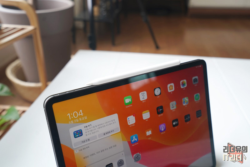 애플 펜슬은 이렇게 위에다 붙여서 사용할 수 있습니다. 아쉬운점은 휴대시 애플펜슬이 쉽게 분리가 되기 때문에 보관을 따로 하면서 사용하는게 좋습니다.