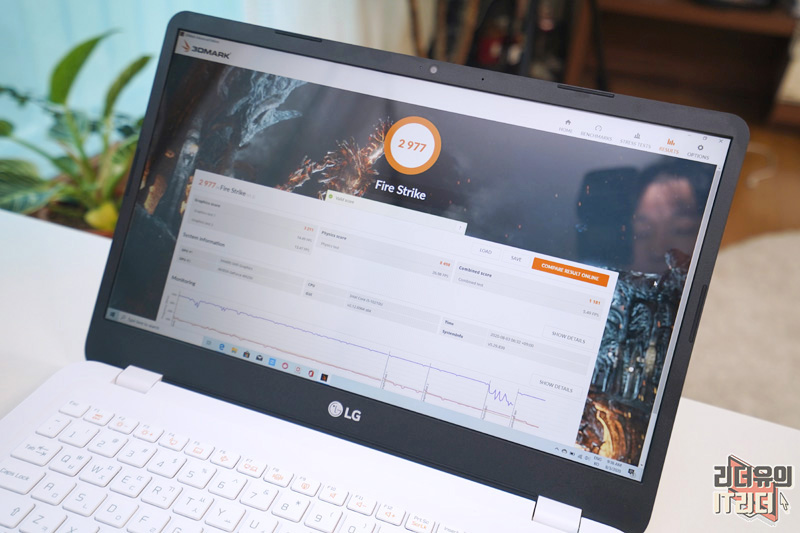 3D mark 점수는 Fire Strike를 돌렸을때 2977점이 나왔습니다. 외장그래픽 카드 NVIDIA® Geforce® MX250을 탑재하고 있어 그래픽 성능도 나쁘지 않음을 알 수 있습니다. 다양한 작업과 휴대성을 고려한 노트북이기 때문에 어느정도 게임을 돌릴 수 있는 성능이라 볼 수 있습니다.