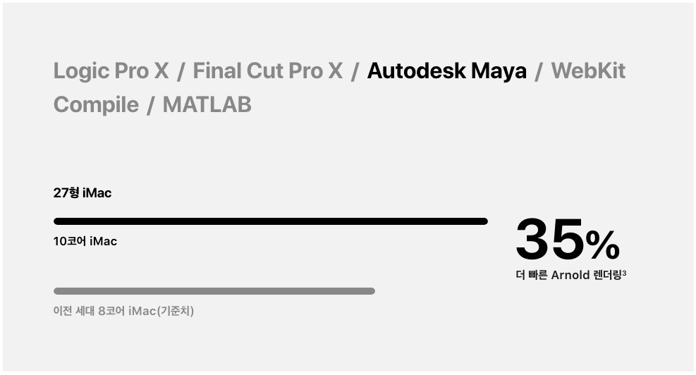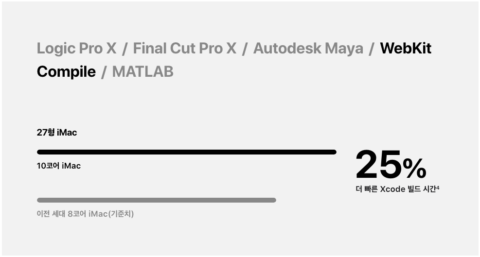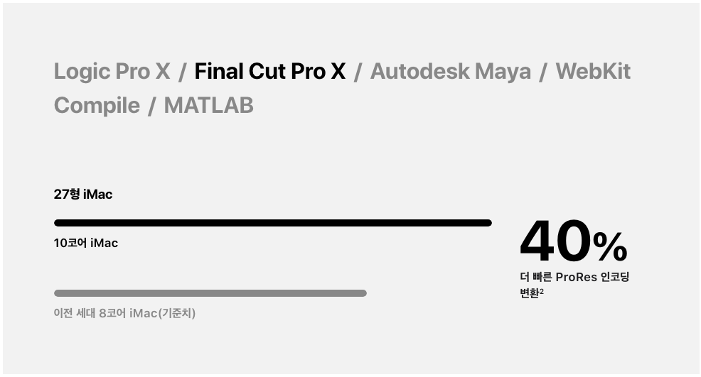 다음은 Logic Pro X, Final Cut Pro X, Autodest Maya, WebKit Compile, MATLAB을 돌렸을때 이전 세대 8코어 아이맥과 10코어 아이맥의 처리 속도 차이입니다.