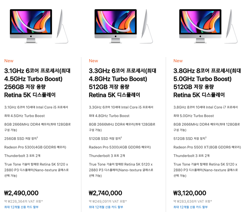2020년 27형 아이맥은 기본 3가지 상품으로 구성되어 있습니다. 256GB 저장공간을 가진 249만원 모델, 512GB 용량을 가진 274만원 모델, 라데온 프로 5500XT 그래픽과 8코어 10세대 인텔 코어 i7으로 차별화를 한 312만원 모델이 있습니다. 249만원 아이맥 27인치는 아무래도 저장용량이 작기 때문에 최소한 274만원 모델 부터 선택하셔야 만족스럽게 사용할 수 있으니 참고해 두시기 바랍니다.