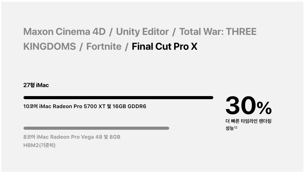제가 가장 많이 사용하는 파이널컷 프로 X의 경우 8코어 아이맥과 Radeon Pro Vega 48 및 8GB와 10코어 아이맥 Radeon Pro 5700 XT 및 16GB GDDR6와 비교했을때 30%나 더 빠른 렌더링 성능을 보여줍니다.