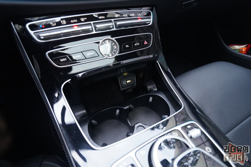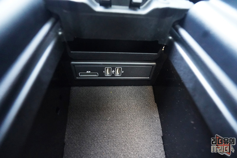 가운데 부분은 누르면 덮개가 열리고 컵홀더 2개를 볼 수 있고 USB 단자 1개가 있습니다.